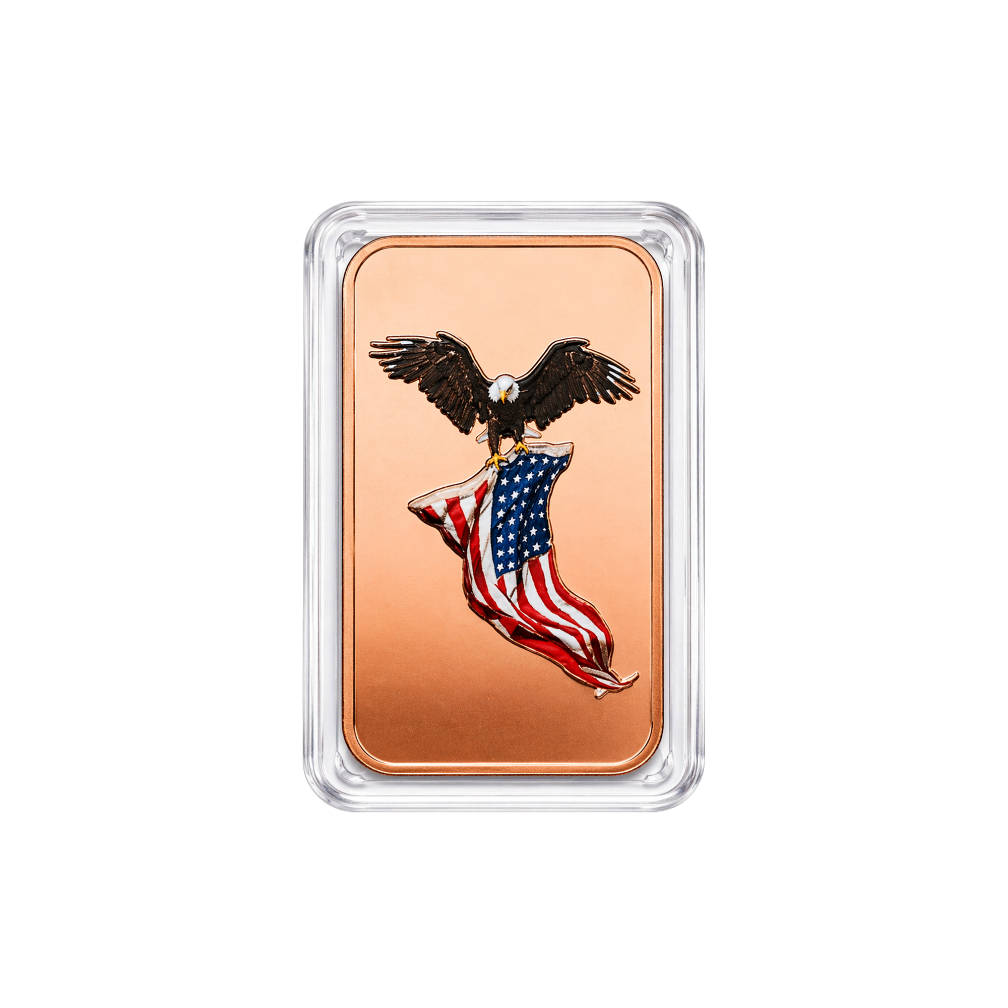 Showcase your patriotism with this 1 troy ounce .999 fine copper Color Eagle Carrying American Flag Bar. Featuring a striking, full-color design of a powerful eagle in flight with the American flag, this piece combines bold imagery with the rich warmth of high-purity copper. Each bar comes protected in a clear capsule, making it perfect for display, gifting, or as a standout addition to any collection.