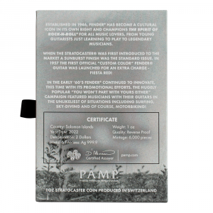 Established in 1946, Fender® has become a cultural icon in its own right and champions THE SPIRIT OF ROCK-N-ROLL® for all music lovers, from young guitarists just learning to play to legendary musicians. When the Stratocaster® guitar was frst introduced to the market a sunburst fnish was the standard issue. In 1957 the frst official “custom color” Fender® guitar was launched for an extra charge – Fiesta Red! This 1oz pure silver guitar shaped coin captures this vibrant retro color perfectly, a nod to the Stratocaster® guitar originals! Fiesta Red follows the first issue, Surf Green. Limited mintage of 6,000 coins.