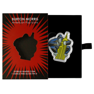 The works of internationally celebrated Pop Culture artist Burton Morris adorn the walls of many a celebrity – Barrack Obama, Oprah Winfrey, and Brad Pitt, to name just a few. Hailed by some as the modern-day Andy Warhol, Morris’ works animate everyday objects to create symbolic statements about popular culture, especially that of the United States. This coin follows the series’ first issue – ‘POP!’ – and features one of filmmaking’s most famous icons – King Kong! The giant gorilla made its big screen debut in 1933 and has since inspired many cartoons, video games and art. Burton’s interpretation entitled ‘Monkey Business’ depicts a more light-hearted version. This 1oz pure silver legal tender coin is engraved and accented with vibrant color to capture Morris’ iconic style. Limited mintage of 2,500 coins.