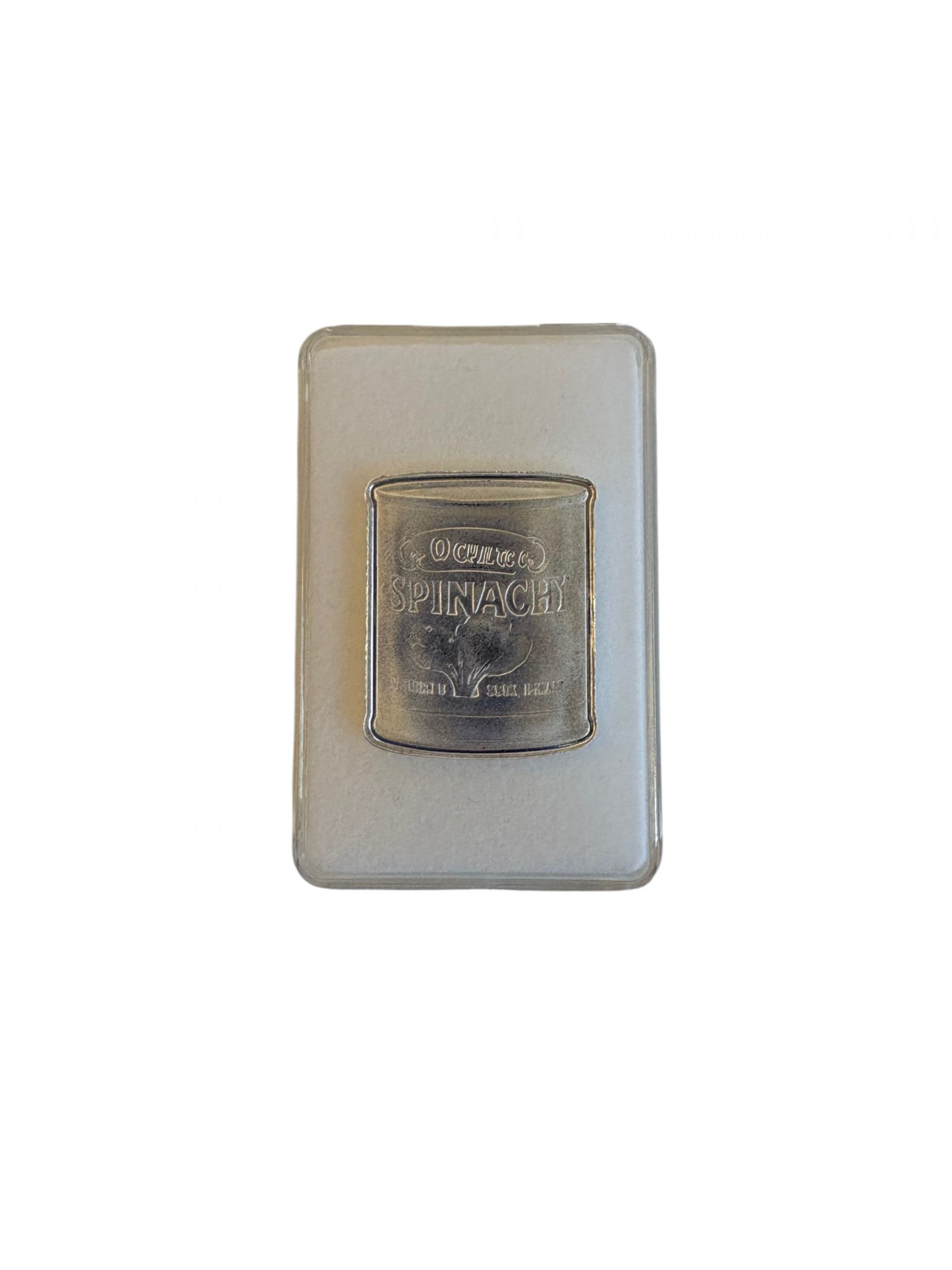 Featuring a detailed depiction of Popeye’s famous can of spinach, the design represents strength, resilience, and timeless cartoon nostalgia. Instantly recognizable, the spinach can is a must-have centerpiece for any Popeye-themed silver collection and pairs perfectly with the Popeye, Olive Oyl, and Sweet Pea pieces.